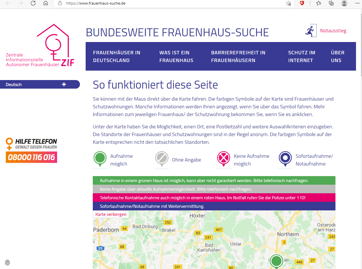 Auf der Website www.frauenhaus-suche.de der Zentralen Informationsstelle autonomer Frauenhäuser kann tagesaktuell die Aufnahmekapazität aller eingetragenen Frauenhäuser und Schutzwohnungen öffentlich eingesehen werden. Von jetzt an können gewaltbetroffene Frauen bundesweit selbständig sehen, wo sie aktuell Schutz und Unterstützung in einem Frauenhaus/einer Schutzwohnung erhalten. Ebenso werden unterstützende Institutionen und Personen in die Lage versetzt, direkt ohne Umwege über Dritte einen Frauenhausplatz zu finden. Die Veröffentlichung dieser Seite stellt einen Meilenstein im Schutz gewaltbetroffener Frauen und ihrer Kinder dar.
