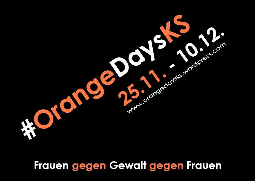 - Eine Postkartenaktion #OrangeDaysKS wird auf 16 Aspekte von Gewalt gegen Frauen aufmerksam machen und auf Hilfeeinrichtungen hinweisen. Die Themenspanne reicht von sexualisierter Gewalt, Catcalling, Vergewaltigung, Femizid, weiblicher Genitalverstümmelung (Female Genital Mutilation), Frauenhandel und Erfahrungen sexualisierter Gewalt in der Lebensgeschichte alter Frauen und ritueller Gewalt bis hin zu sexueller Belästigung am Arbeitsplatz und Zwangsheirat (www.orangedaysks.wordpress.com )